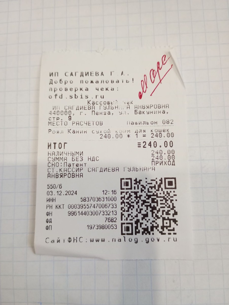 240,00 руб. Корм Роял Канин сухой для кошек Уринари S/O (0,200 * 1 200,00 )