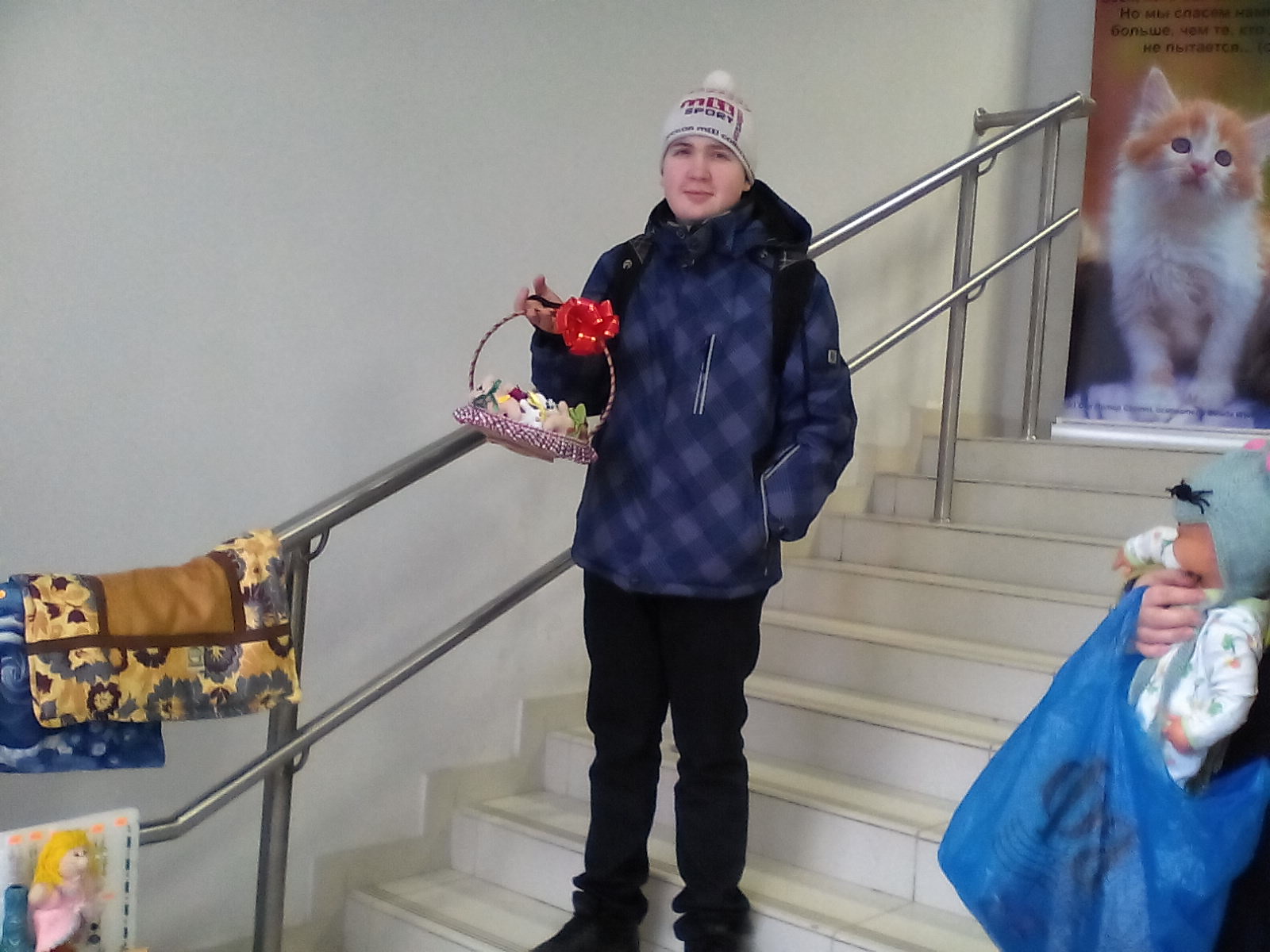 к нам подошла женщина и принесла корм и т.п. и лежачки (сшила сама), их штук 10 было, 7 купили сразу (Юля посторалась :) ).