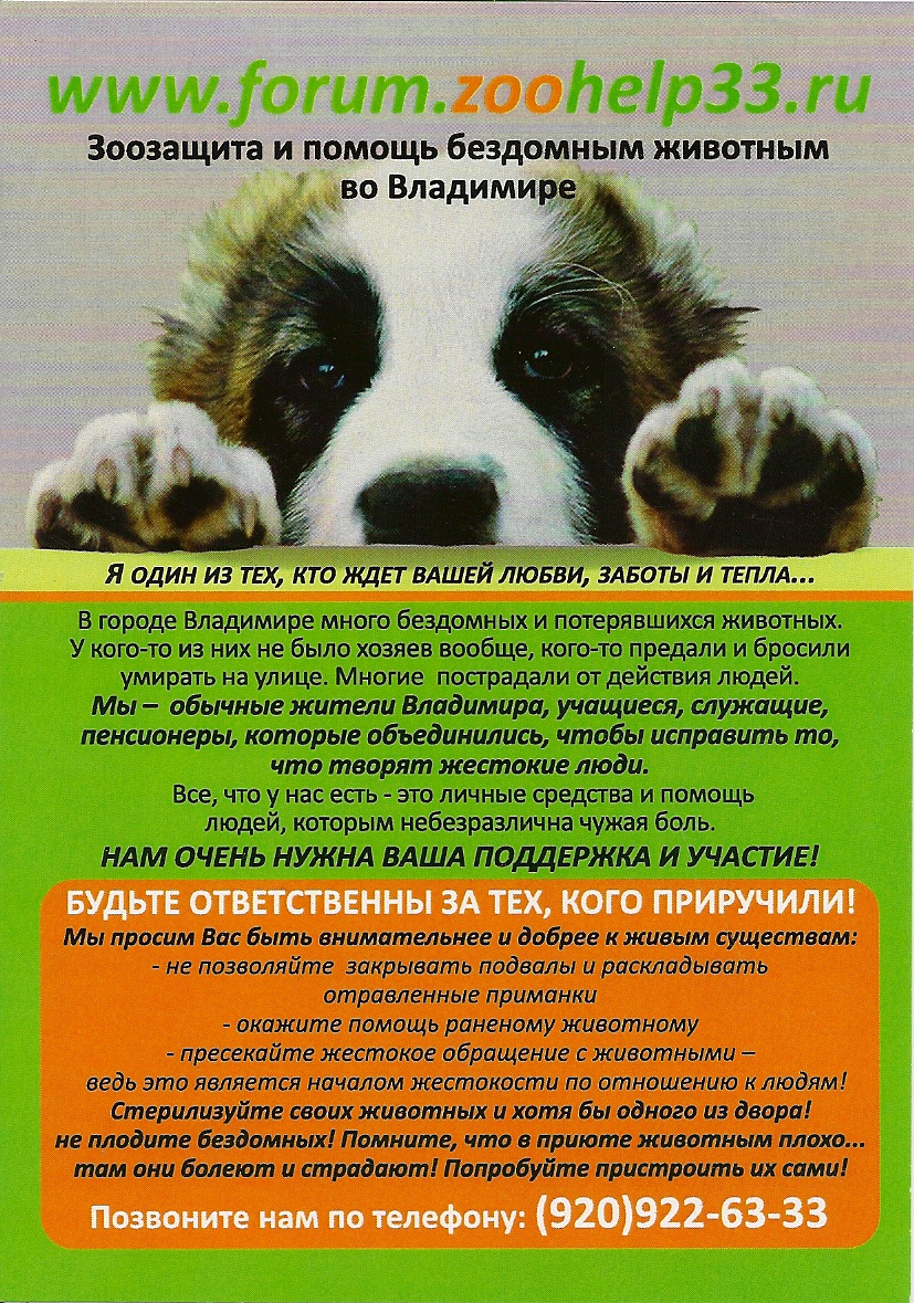 но сейчас надо именно размер визитки и именно уже в готовом виде по 8-10 штук на листе А4 формата, (можно в Ворде), чтобы те, кто смог - распечатал на принтере. Там только адрес сайта и фраза про стрелизацию домашних животных, чтобы прекратить пополнение бездомников или фраза любая короткая. ИМХО. На акциях обычно спрашивают как нас найти в интернете и чтобы каждый раз не писать самим на листках и не объяснять как зайти на сам форум. (Листовки закончились), поэтому хорошо бы уже заготовить хотя бы визитки.