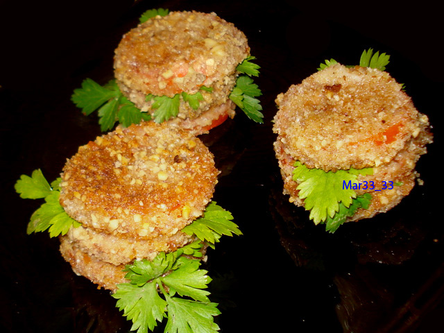 4.Помидоры обмакнуть в муке, потом в яйце, потом в сухарно-ореховой смеси.