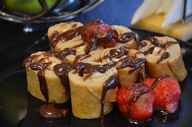 Замесить тесто для блинов и выпекать на сковороде. Для приготовления крема существует 2 варианта: 1) можно сделать соевый йогурт в домашних условиях , для этого в соевый йогурт нужно поместить молочные бактерии и оставить в теплом месте на сутки, затем процедить, бактерии поместить в небольшое количество забродившего соевого молока и поставить в холодильник. 2) подогреть соевое молоко на огне, и постепенно добавлять муку до загустения, остудить.Затем и для 1 и для 2 варианта добавить клубнику, сахар, корицу и ванилин и взбить блендером. Готовый блинчик промазать кремом,выложить бананы и клубнику, порезанные тонкими ломтиками, и завернуть в трубочку. Оставить на 5-10 минут, затем порезать на роллы. Для глазури: темный шоколад растопить на водяной бане, добавить немного соевого молока, все перемешать и полить роллы. Можно посыпать сверху сахарной пудрой и украсить листиком мяты.