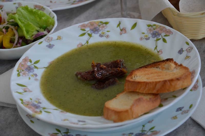 В кипящую воду добавить картофель и цукини, порезанные кубиками, посолить, добавить специи (перец черный, имбирь, мускатный орех, базилик или любые другие). За 3 минуты до готовности добавить спаржу и шпинат. Все взбить блендером и накрыть крышкой. Подавать с вялеными помидорами и гренками.