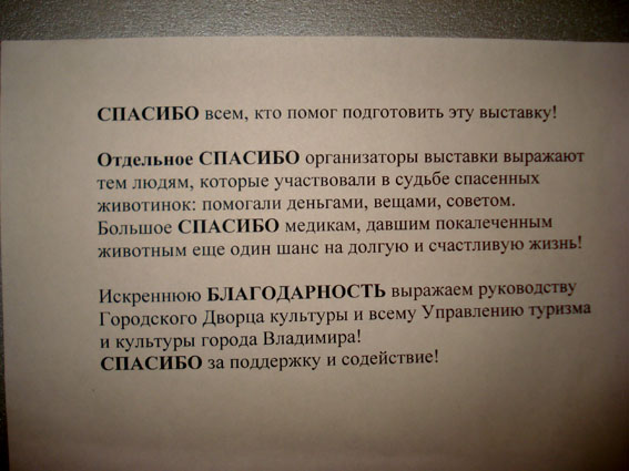 Я пока на выставке. депутаство вооаще нас задвинуло к стене. но народу и так нет. принесли пока неск.пакетов влажн.корма, бинты шприцы, лекарства.