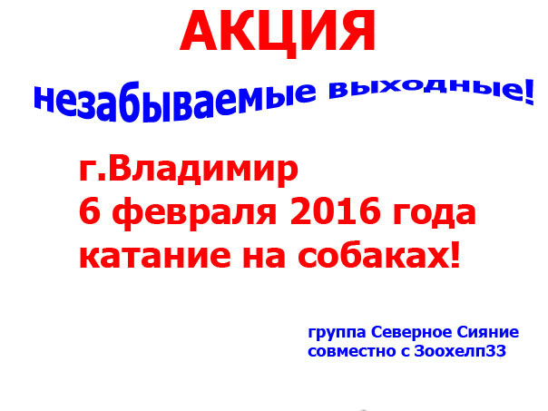 6 февраля (суббота) Группа катания "Северное сияние" (https://vk.com/club107809266) совместно с Зоохелп33 предлагает провести незабываемые выходные! Вы можете покататься в упряжка с собаками и сделать красивые фото на память. Часть денег пойдет на стерилизацию бездомных животных! (200 рублей с каждой поездки)