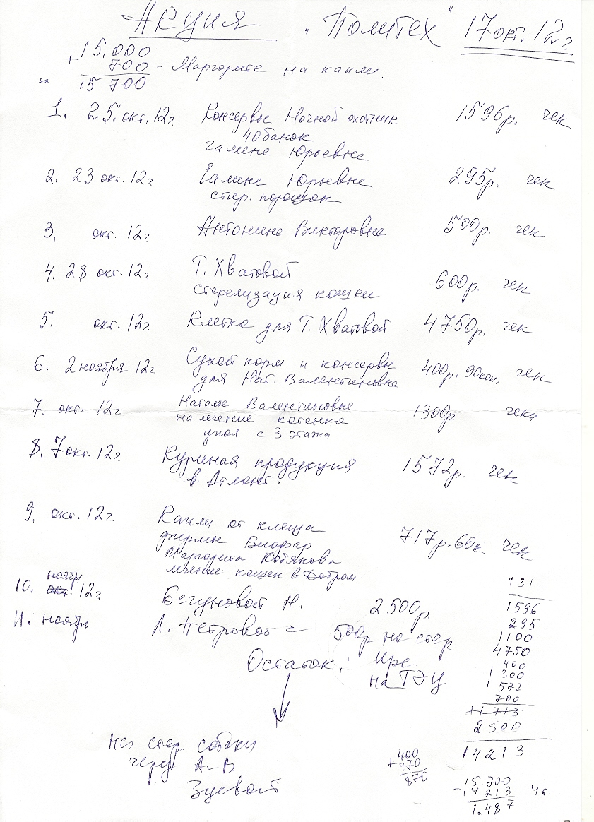 Остаток: 500 рублей (сейчас у меня). Планируется пойти на стерилизацию собак у ТЭЦ.