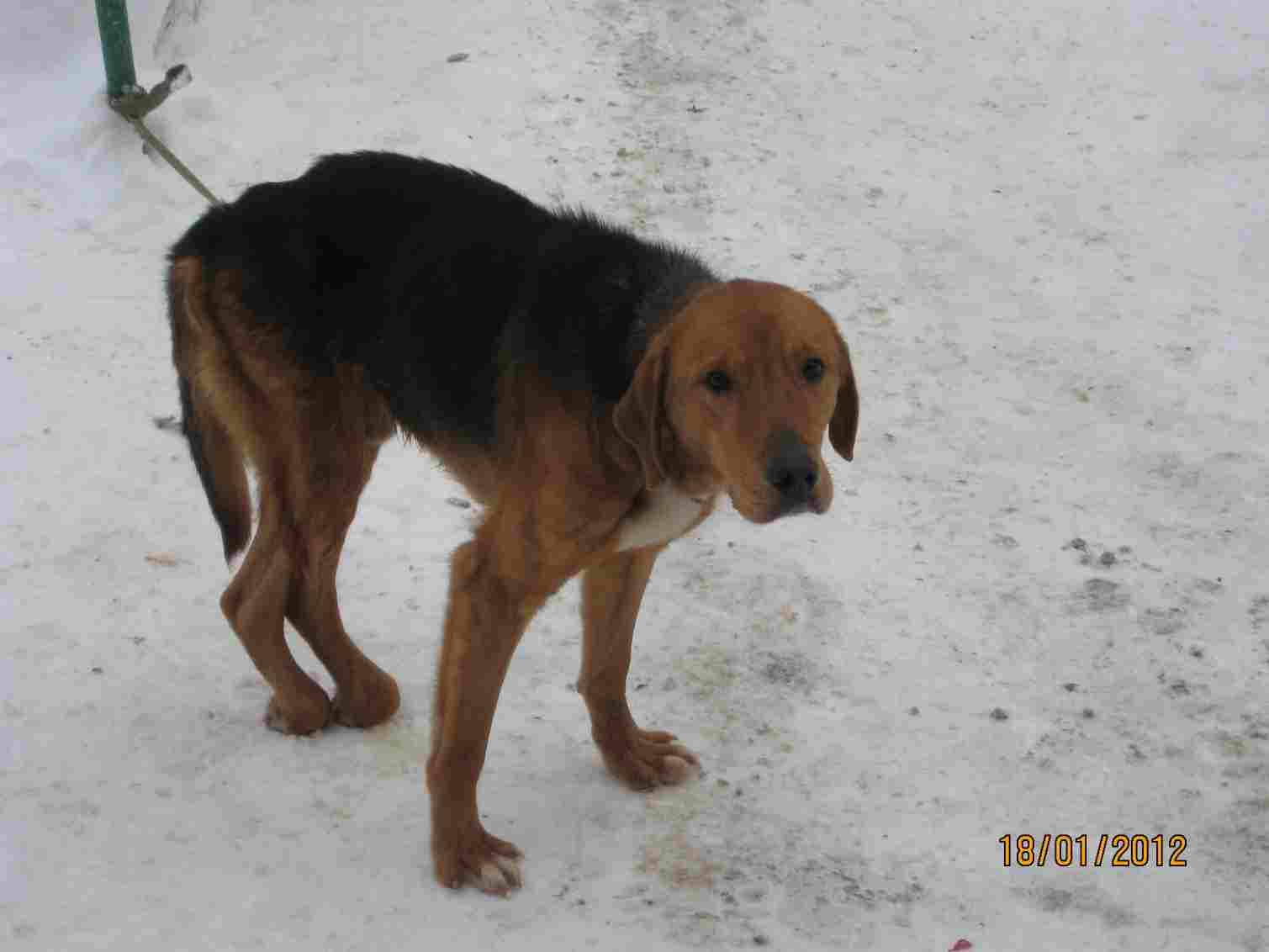 Этой ночью из д. Малышево, Судогодского района привезли гончака. Он бродил по деревне видно уже давно. Пса скорее всего когда то сбила машина, он еле еле передвигается, обратите внимание на задние лапы, они внизу аж вывернуты, скорее всего частичный парез нервов. У пса сильное истощение и обезвоживание. От тарелки с едой и миски с водой не отходит.