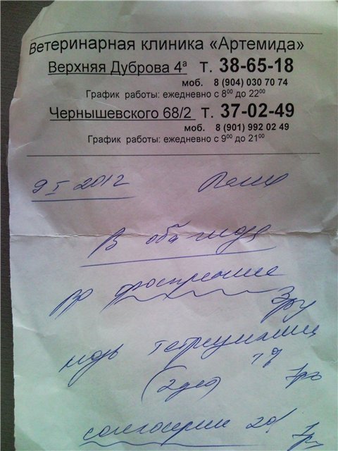 Сегодня были на приеме у врача. Диагноз: гранулематозная энцефалопатия (Воспаление внутреннего уха (кривошея)). Вот ссылка по этой болезни http://www.vetclinica.ru/news/example/i ... Oc6=194229 Вообщем прогноз не утешительный(((( Пока назначали дексаметазон, эмицидин, церебрум-композитум и церебрамин (гомеопатия), ну и альбен-С (на всякий случай). Если через пару недель улучшения не будет, будем подбирать другой курс лечения. Врач сказала, что 99% из 100% все останется так как есть(((