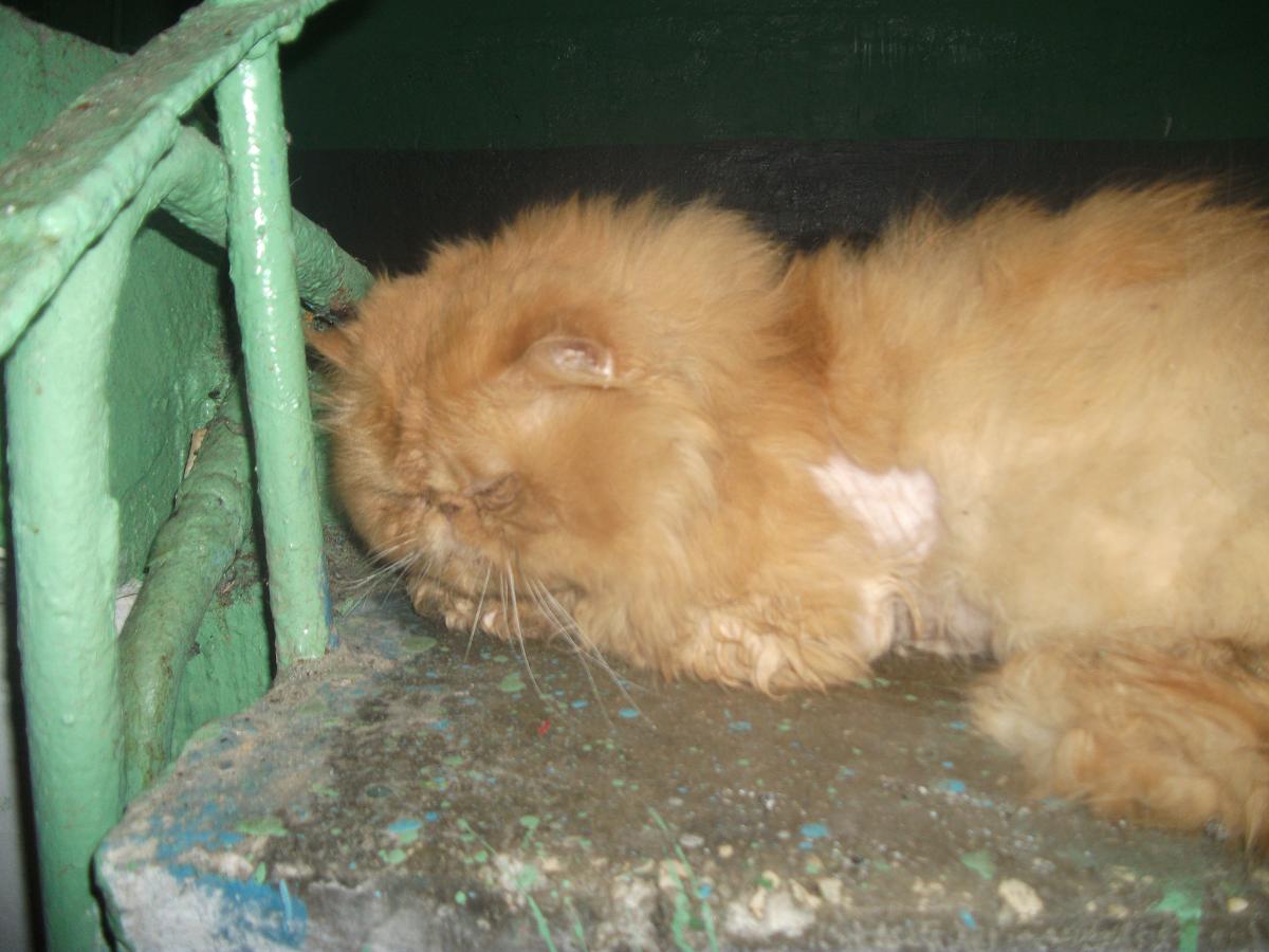 предыдущий текст от 07.04.12.В субботу вечером подбросили в подъезд №10 по ул. Куйбышева д.58. Шерсть на животе отсутствует по непонятным причинам. Глаза рыжие. Видимо был домашним.