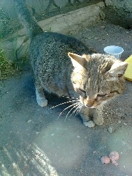 Эту беременную кошку я уже который день встречаю у входа в корпус Пединститута, что напротив Золотых Ворот. От вахтёра узнал, что кошка не институтская. Значит, либо бездомная, либо приходит сюда кормиться из частного сектора (ул. 1-я и 2-я Никольская). Хотя я не замечал, чтобы её кто-то кормил. Видел только, как она трётся о ноги студенток, выходящих покурить. Обычно бездомные беременные кошки ищут место, где могли бы окотиться. А может, она просит пищи. Я поставил ей миску с водой и время от времени подкармливаю. Но бывать здесь могу раза 2-3 в неделю. Может, у кого получится пройти мимо и что-нибудь ей положить поесть и налить воды? Кошку не всегда можно увидеть (возможно, она прячется от солнца), поэтому нужно позвать «кс-кс». Сначала возникла мысль отвезти её в приют; но решил, что это не тот случай. Что если она всё же чья-то? А в приюте её посадят в клетку-тюрьму. А у неё и так очень грустный взгляд.