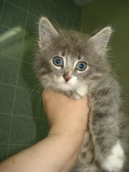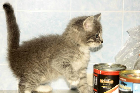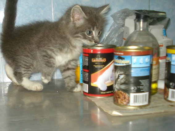 Ищет семью маленький малыш. Мальчишка, серенький с белым, 2 месяца.
