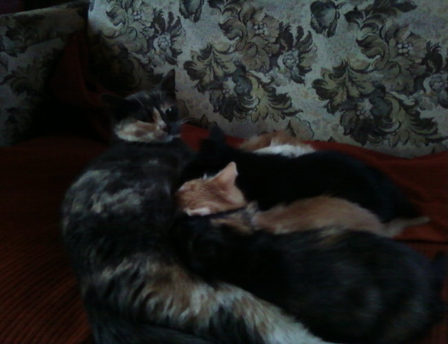 Четверым котятам(возраст около 3-х месяцев) и кошке. Живут на турбазе, в дом не разрешают пускать, кормят три дня через неделю, кругом лес, до ближайшего населенного пункта 6 км. Пока котята здоровые. Кошку подбросили на турбазу.