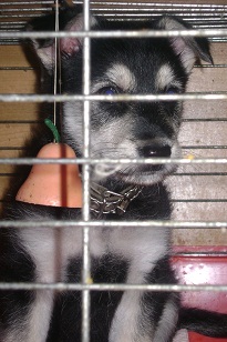 Этого щенка принесли сегодня,ему месяц-полтора. Посадили в клетку для кошек. Он там скулит и воет,не понимает за что его туда посадили.Вырастит,будет не большой собакой.