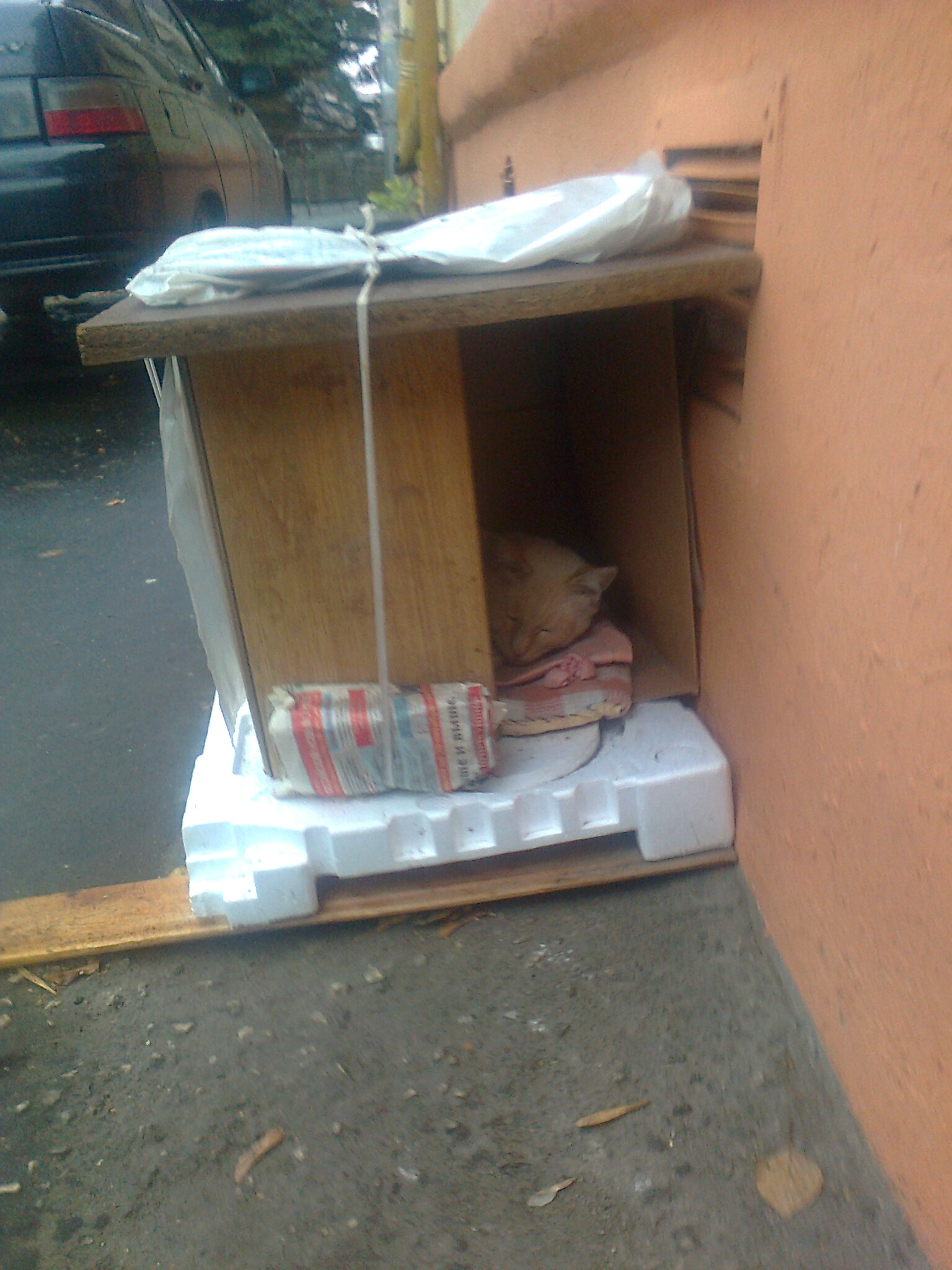 Он, несмотря на домик, в опасности, как от собак, людей, так и холода. тут и коврики не спасут, хотя, их принесли, явно, заботливые люди