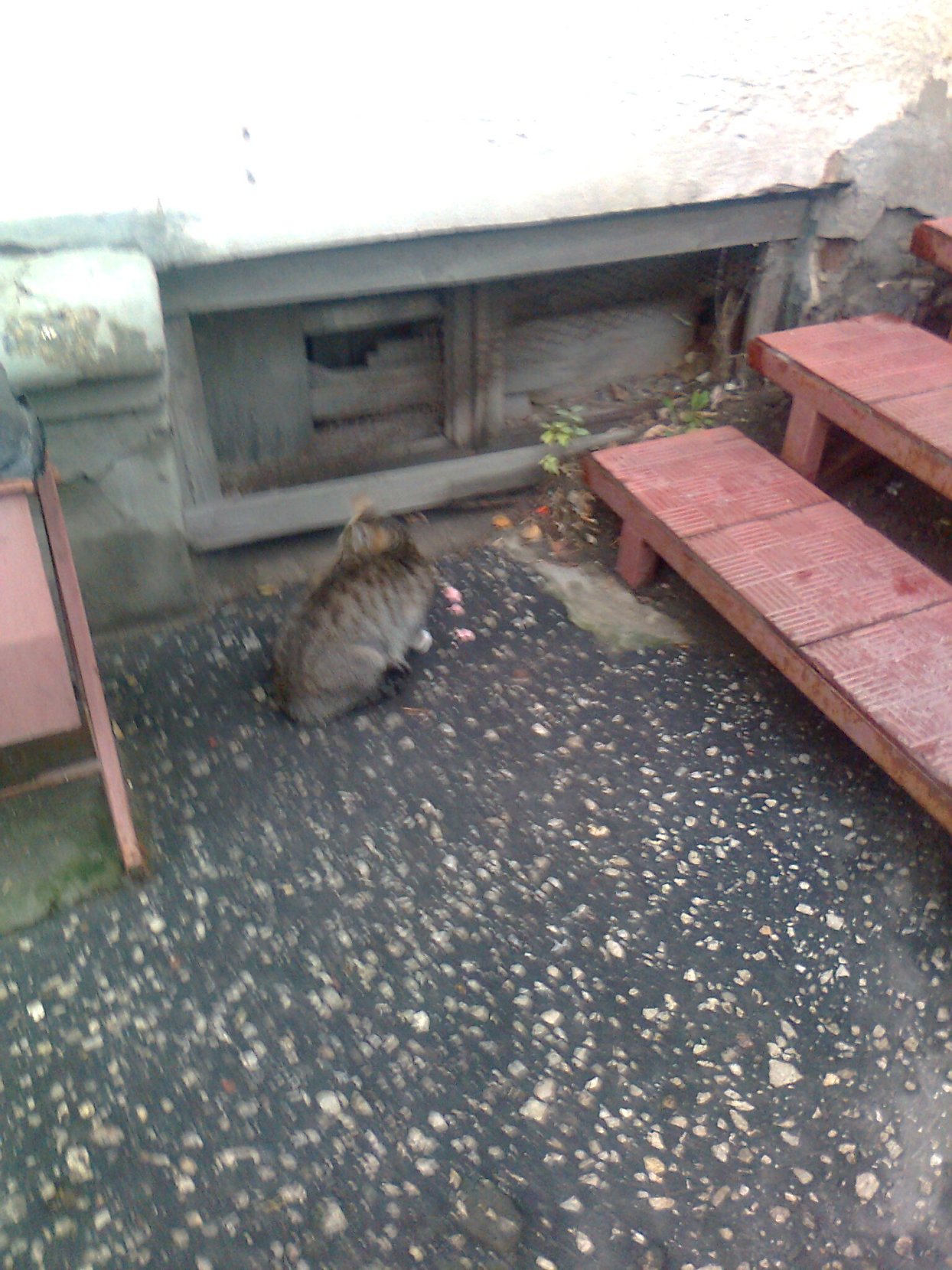 Это какая-то кошка-призрак. Только что сидела и уминала колбасу. Я ненадолго отвернулся, глядь - её уже нигде нет. Прошёл вдоль стены дома, вернулся, смотрю - она опять сидит на том же месте. Осмотрел подвальное окошко возле лестницы (у магазина "Диск") - там, по-моему, всё заколочено. Но больше ей некуда было нырнуть. Как она туда пролезла и где там лазейка - уму непостижимо!