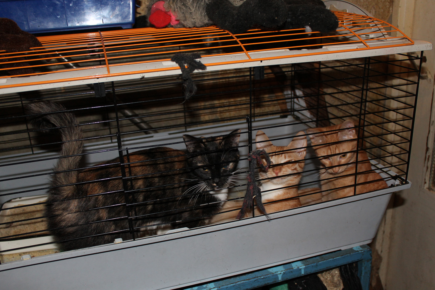 Сейчас мы ей купили две большие клетки. Думаю многих она по ним распихает (а то вся кухня в кошках). Если бы не море вещей, можно было бы и еще клеток привезти и расставить по стене.