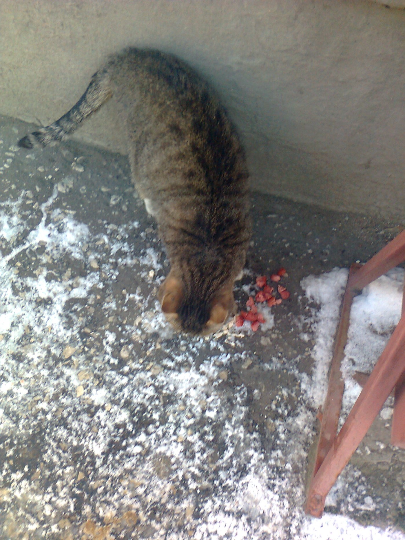Сегодня вечером наша серая красавица с белыми лапками опять была на остановке "Всполье". Ласкается о ноги людей, очень доверчивая - это опасно. Я отвёл её снова к дому № 44 по ул. Горького и накормил. Кстати, а в подвале она кушает? Ей лично достаётся? Что-то она ужасно голодная.