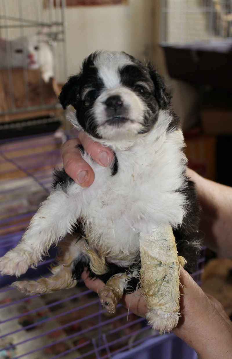 щеночек, либо ооочень маленький по возрасту, либо будет маленьким, думаем где-то 1,5 месяца, сначала вообще был без зубов. ну в общем как всегда, ей показывают и говорят, не возьмешь - выкинем. у него лапка была сломана, ходила к Мумже, он все сделал, сейчас в гипсе, даже все бесплатно сделал, спасибо ему.