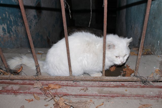 зато нашли другую компанию, думаю кот и кошка в нашем подвале. Белый скорее всего кот (честно даже забыла посмотреть), с виду скорее всего старый, а может побитый жизнью, ушки обморожены, вроде и толстый, но хребет прощупывается, ручной!! Кошечка, подойти хочет, но побаивается...