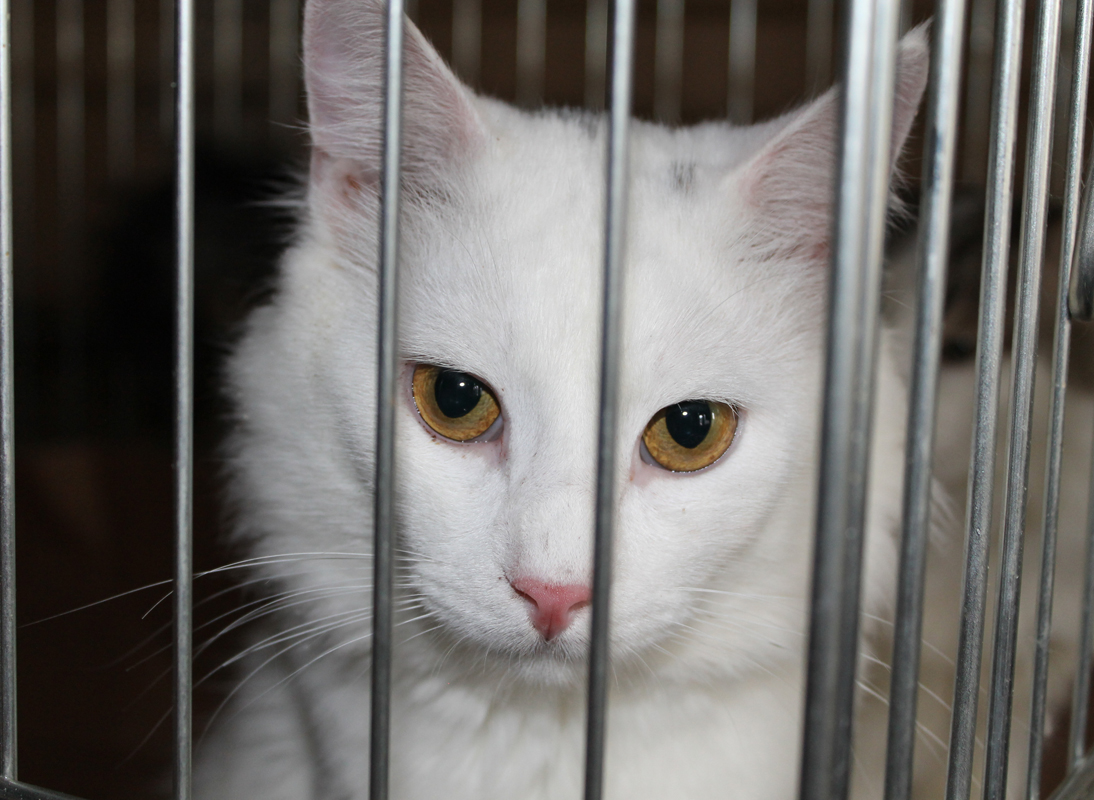 белый кот, точный возраст не знаю, ну года 2-3 наверное есть. очень очень ласковый, постоянно трется об клетку, постоянно просит внимания. очень жалко смотреть на него, как он мучается в клетке(((