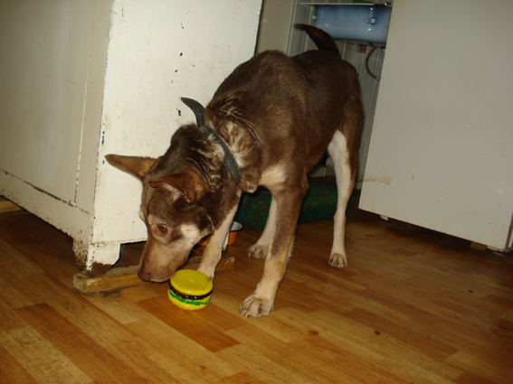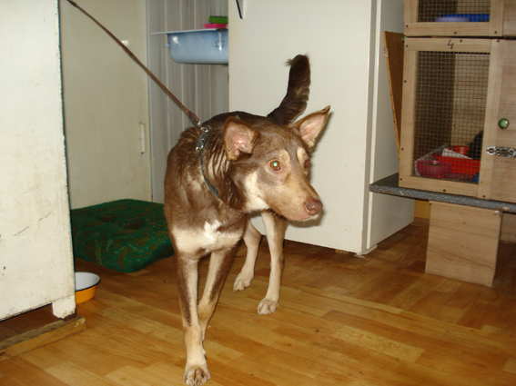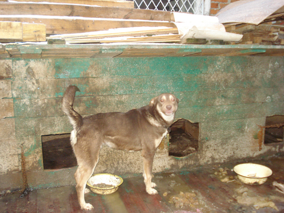 Коштанку сняла на видео (чуть позже вставлю), но цвет на видео - искажает. Сама она коричневая (в роду точно кто-то был). Ей до года. Резвится и играет как щенок. Сейчас пока в комннате -терапии (смотровая команат), но скоро отправят в уличный вальер обратно в будку