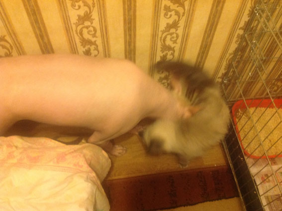 Она сейчас после наркоза сразу к нему доползла, начала сикать на пелёнку, так он её переложил на сухое и всю вылизал."