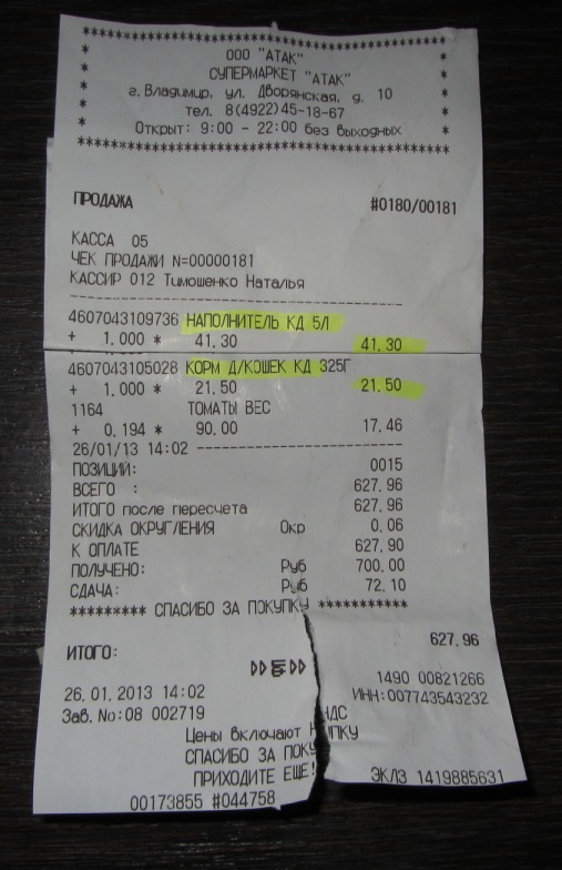 62р. - наполнитель и корм чек от 26.01