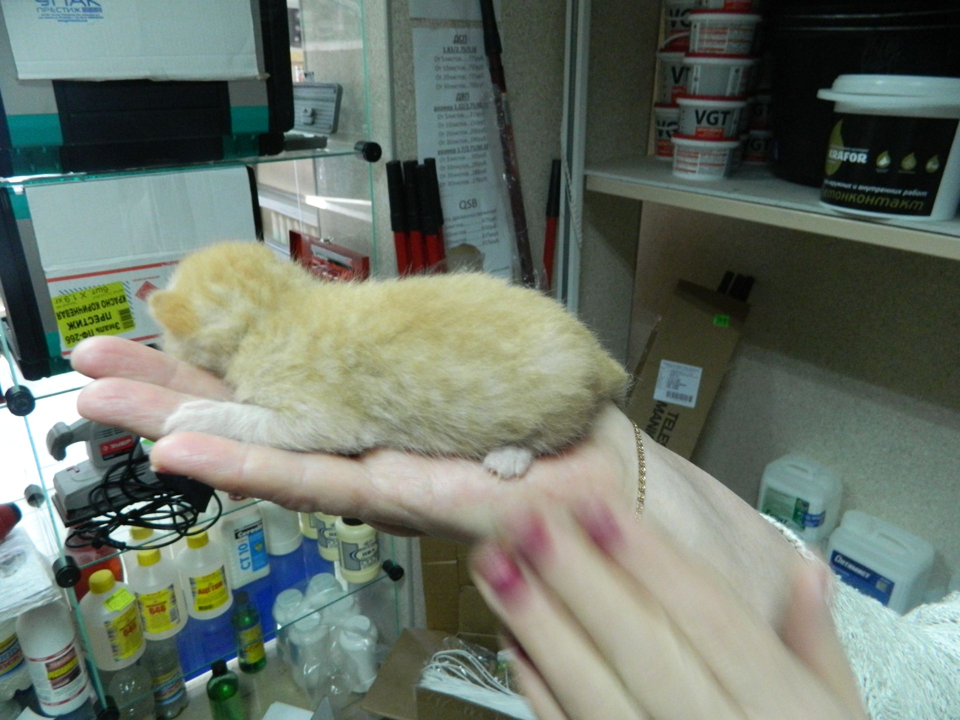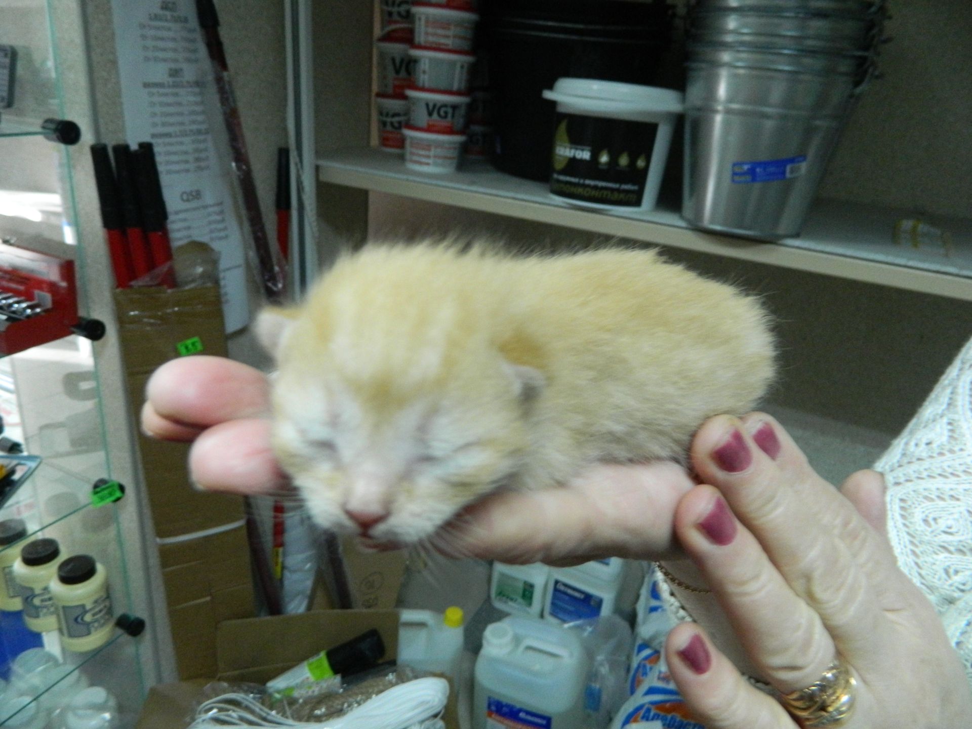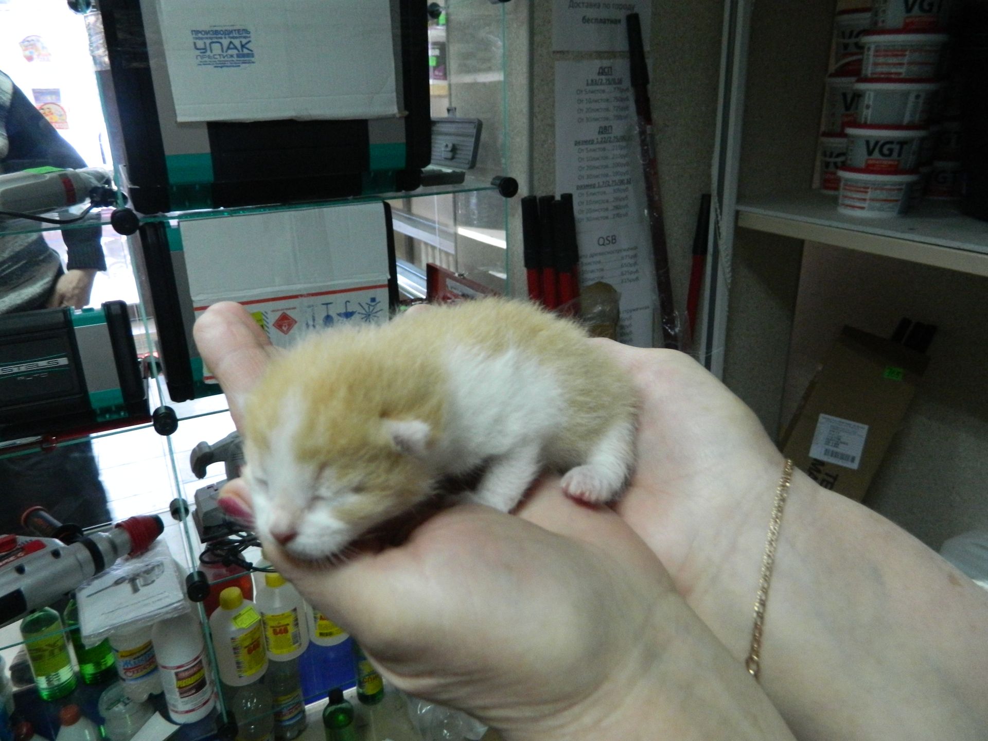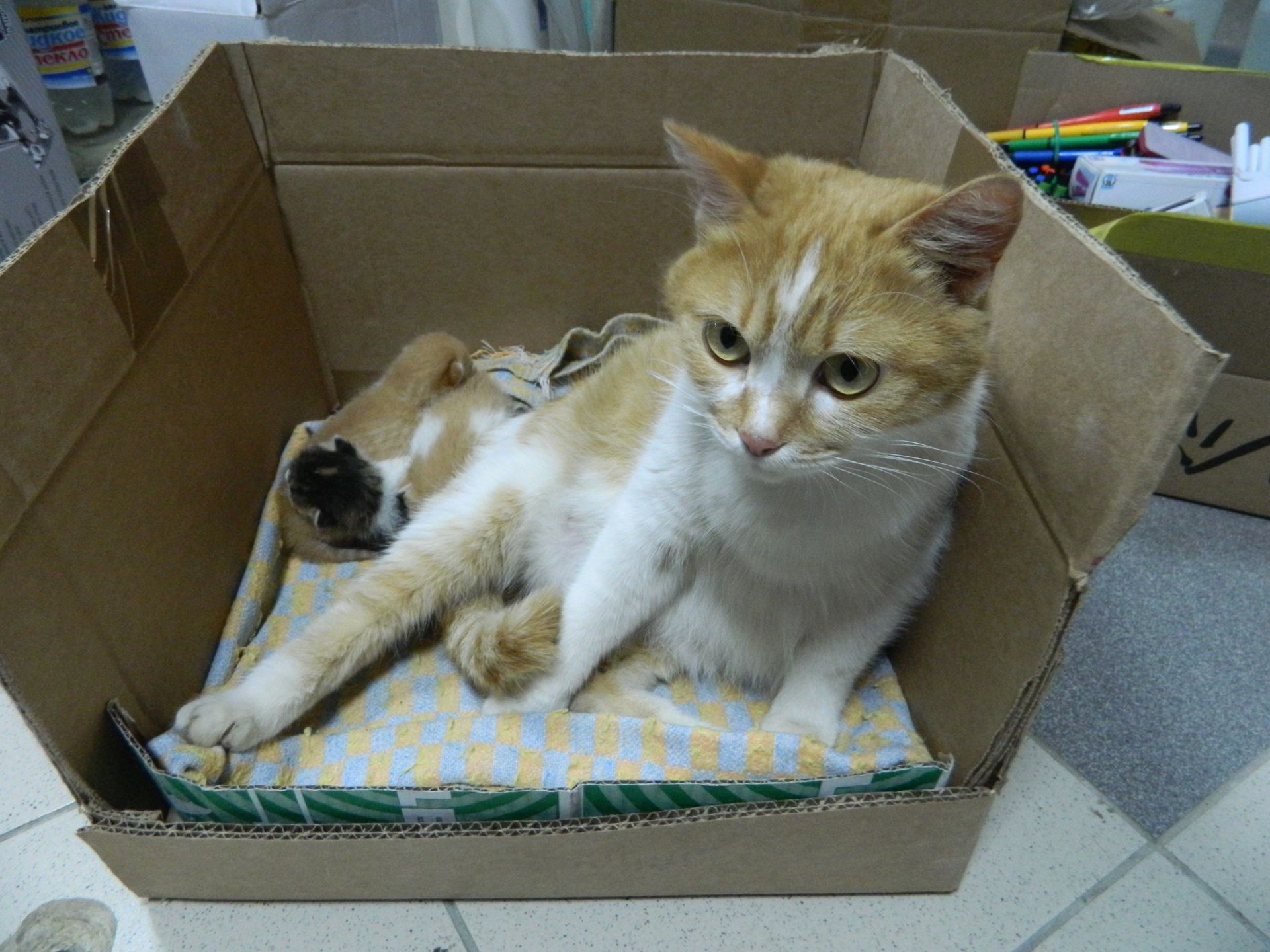 Кошка с детьми пока живет в магазине, но хозяйка беспокоится об их пристройстве. Приносим молоко, корм, вареную рыбку. Купили лекарства от блох и клещей, но капать на холку боимся, т.к. котята бывает по ней ползают и могут лизнуть. Сегодня ночью они все пропали. После долгих поисков оказалось, что мама перетащила свое потомство глубоко и далеко в угол за кучу стройматериалов.