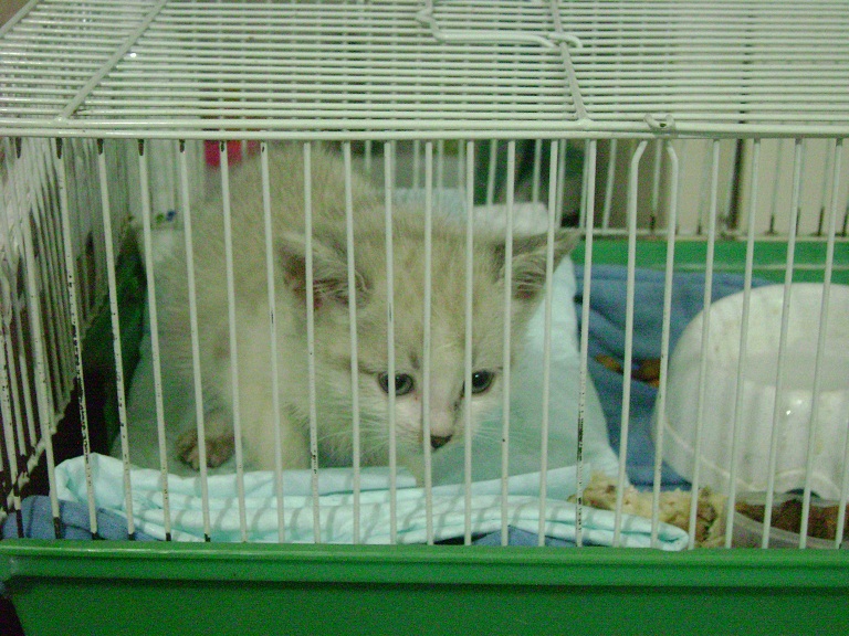 Котята.Беленькая девочка постоянно плачет,маленькая еще оставаться одной,а кошки, к которой можно подсадить нет. Успокаивается только на руках.
