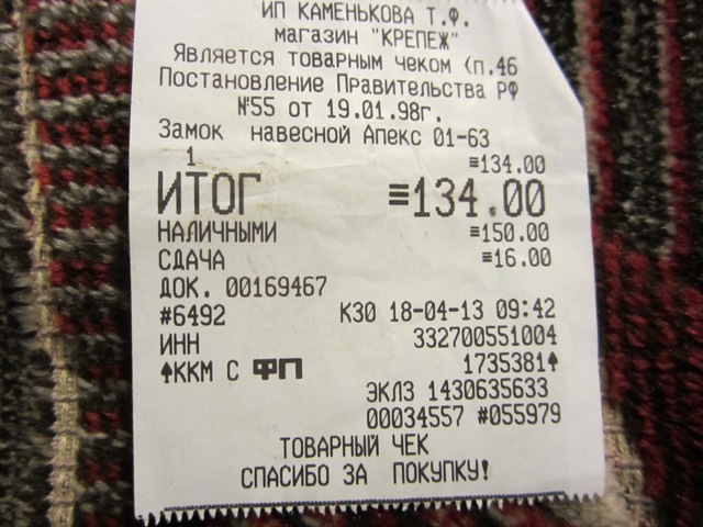 На кошачьем вольере помер замок окончательно. Купили новый. Чек: