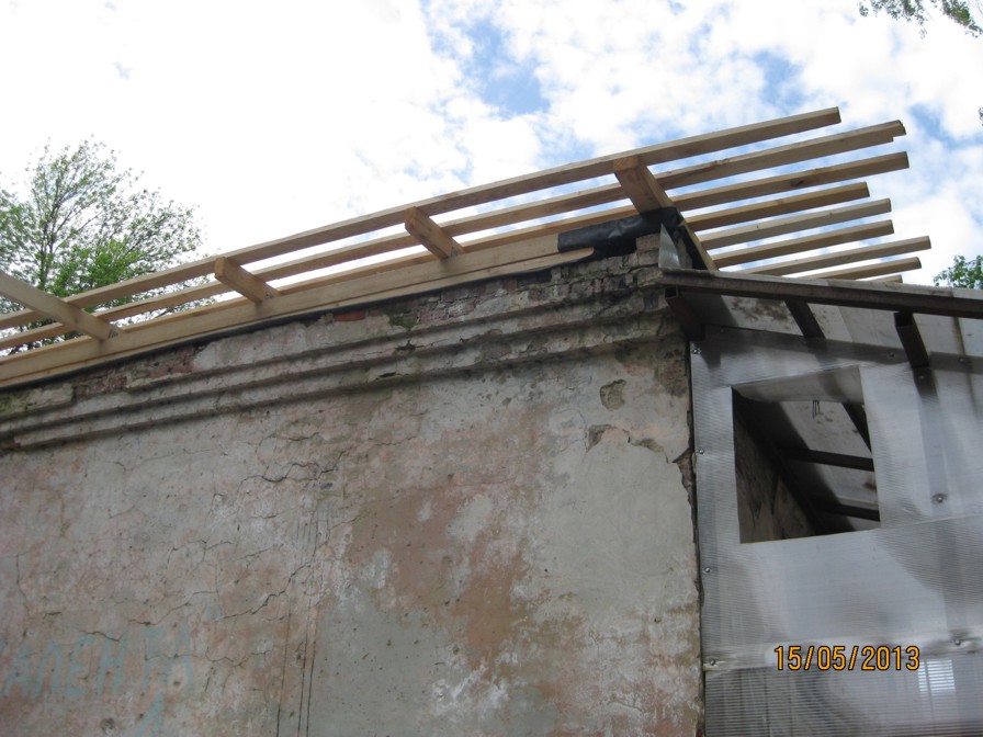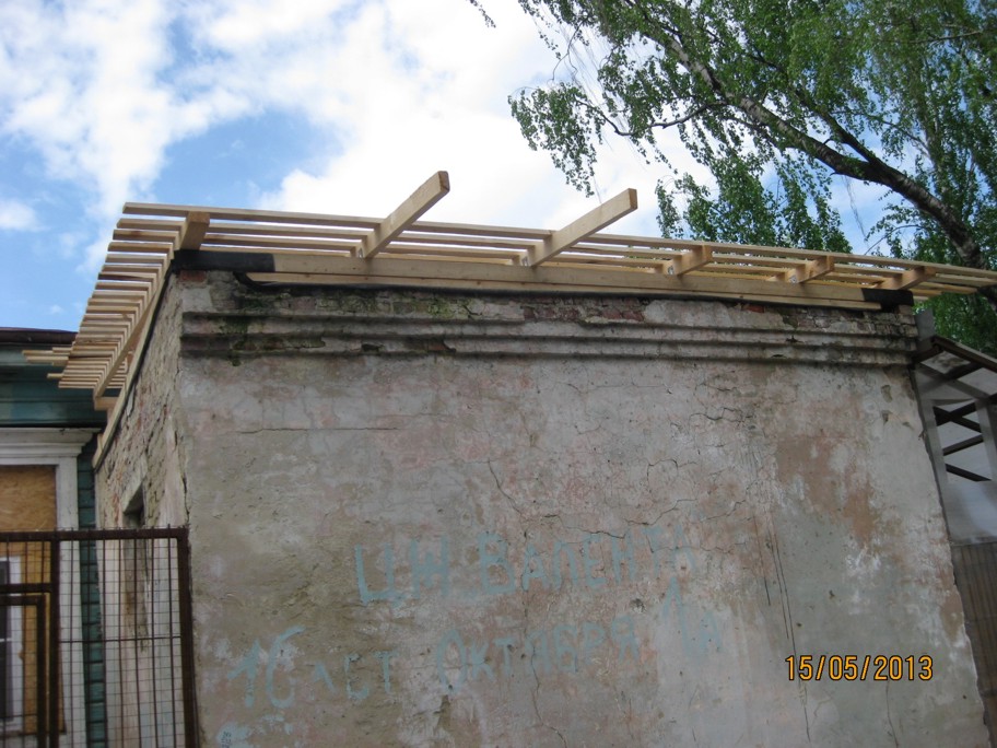 1.Виктор и Алексей вчера вечером демонтировали крышу (Ой))) Это была такая крыша с такой кровлей))) Досочки тоньше моего мизинца, в середине ванна - чтоб вода ни в коем случае не стекала, а шуровала вниз на перекрытия и по стенам на электропроводку))). К стенам совсем не закреплена, держалась на честном слове. Кирпичи! поставлены на рубероид!))). Выяснилось, что под крышей крысы нарыли нор + утеплитель превратившийсяв кашу и ВОДА! по щиколотку как в бассейне.