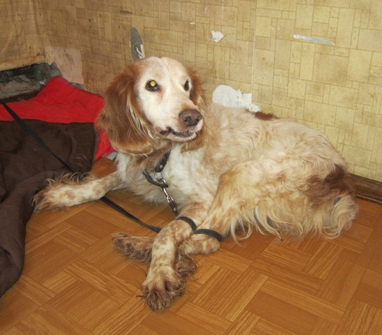 И очень симпатичный рыже-пегий русский спаниэль. Кобель. Старенький. Несчастный. Курлычет как гусёнок. Может, кто захочет приютить????