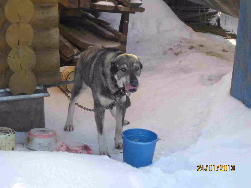 Как удалось выяснить, у хозяина было 2 серьезные собаки.Поменялся график работы и собаки не вписывались в его жизненный уклад. Одну он пристроил сам, а алабая девать было некуда и он отправил "выживать" без еды и воды на привязь на свой участок, ( и это тогда, когда летне-дачный сезон уже закончился и в деревне никого не осталось).