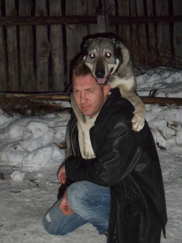 фото из дома, оч.хорошшо показывает... что мир не без добрых людей. Новый хозяин! (даже не верится...что это фото сделано почти сразу как только пес стал жить в НОВОМ доме). это же алабай... который никому не доверял,даже бабуля его побаивалась и кормила "издали"