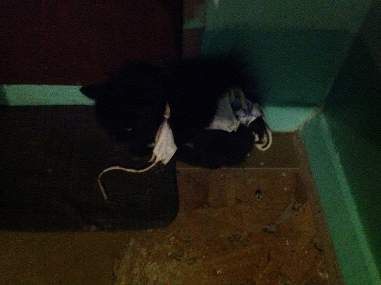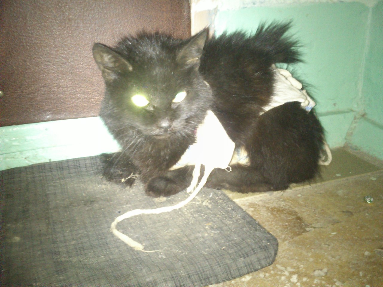 Кто-то потерял угольно-черную маленькую кошку!!! На ней повязки из ветеринарной клиники. Видимо только после операции!!!!! Сидит в подъезде на ул. Нижняя Дуброва уже второй день.