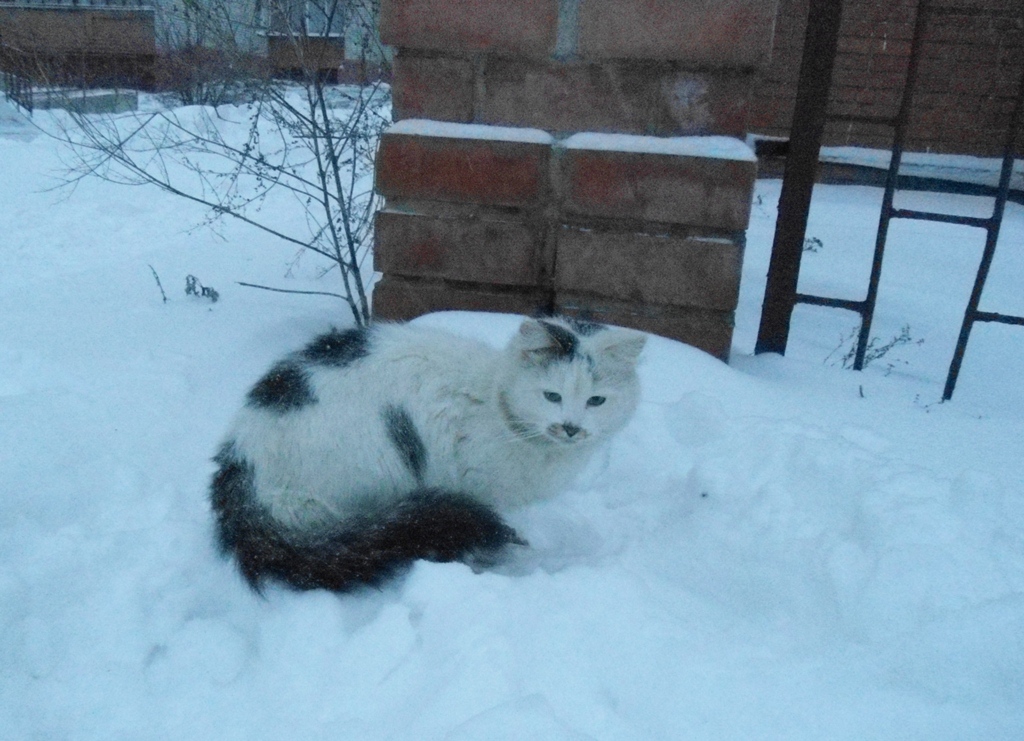 Он периодически убегает за людьми, потом опять возвращается, сегодня утром кормила его, он появился недавно пару недель назад...а черно-белый это кот, он живет где-то рядом с Сириусом или в доме за торговым центром (в котором я живу), по вечерам, когда приезжаю домой тоже подкармливаю его...