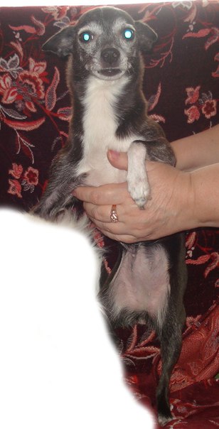 Она очень старенькая, окрас черный и белые лапки, но вся шерсть покрыта сединой. зубов почти нет, глухая. длинный тонкий хвостик. Была без ошейника.
