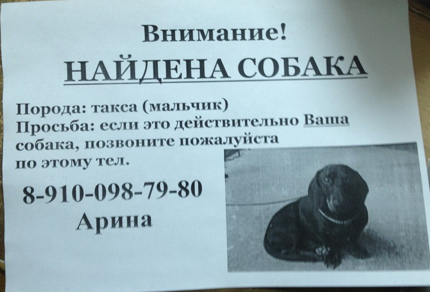 девочка которая ее нашла как раз распечатала обьявления и пошла развешивать по району! Мама ей не разрешила таксика оставить себе, и они ей уже нашли новый дом, и если в ближайшее время никто не откликнится песик уедит...