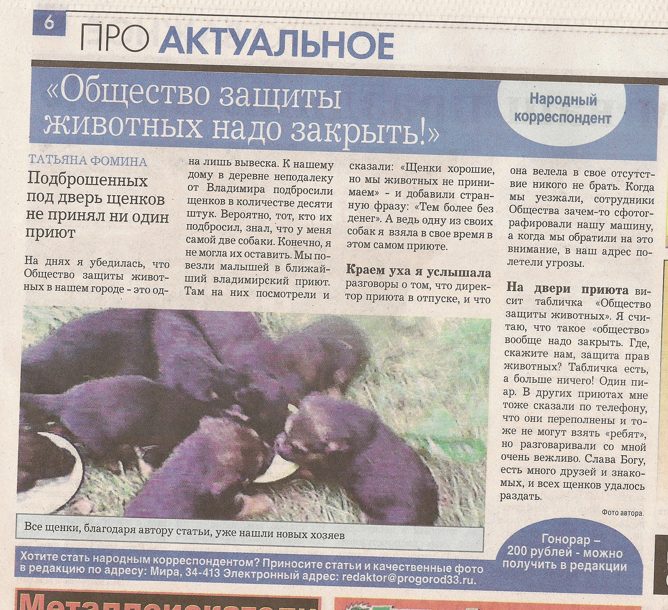 Автор статьи получил гонорар! Жаль мало. Совесть не купишь. Щенков пристоили сами, медаль им на грудь, так зачем везти в приют, если СМОГЛИ сами.