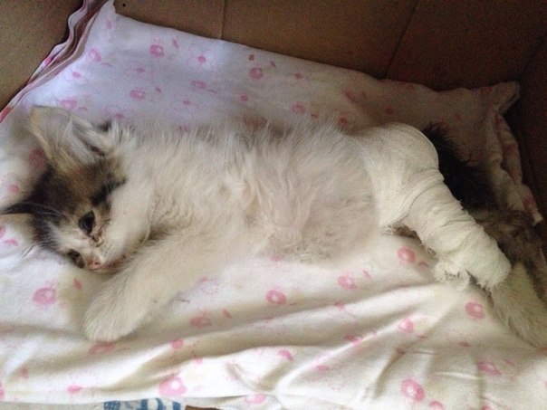 Добрый день ! Очень ищем заботливого хозяинаВчера писала здесь о котятах у нашего подъезда , подробно расскажу о том у которого сломана лапка , кость торчала наружу. Сегодня отвезла его к ветеринару - сделали операцию, наложили швы и гипс, сейчас он находиться в ветклинике , так как сам передвигаться не может , плюс ему котят антибиотики, и обезбаливающие . Долго находиться она там не сможет !!! Котенок - девочка , ей примерно 1,5 месяца. Мой номер 8 910 098 5510