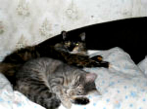 Всем привет. У нас все хорошо. Девочку назвали Маруся. Со страршей кошкой, Фросей, любовь. Маруська, видимо, считает ее своей мамкой: ходит за ней хвостом и писает исключительно в ее лоток. Спят в обнимку, лижутся, по ночам носятся как кони. Весело
