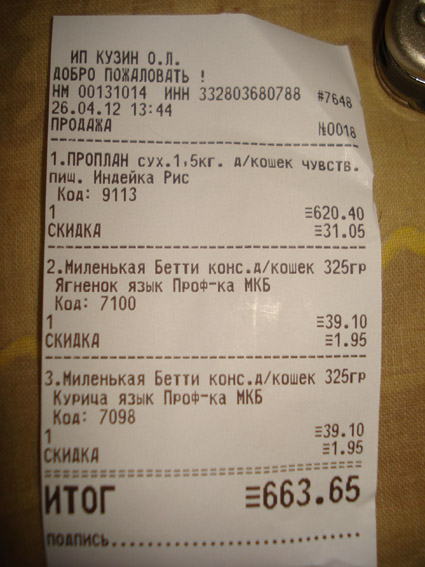 Корм я сейчас купила - 1,5 кг Проплан (если покупать сразу большой пакет, то получается гораздо дешевле) + 2 банки консервов (на послеоперационный период, вдруг от сухого откажется).