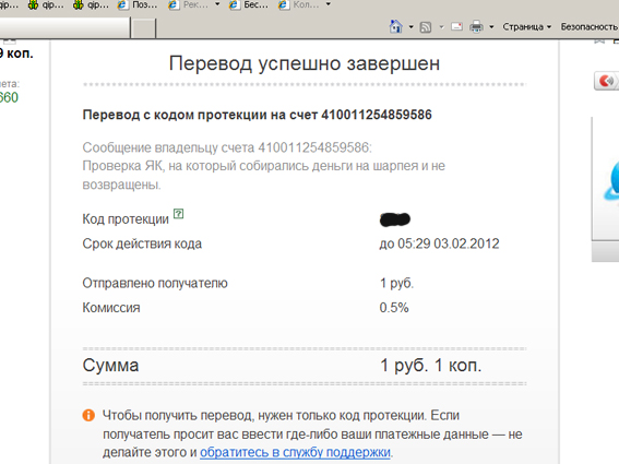 А это я сейчас проверила. Перевела с кодом протекции 1,01 рубль на ЯК (открытый Алена1989 с нашего ЯК. Деньги благополучно были отправлены и доставлены на данный ЯК.