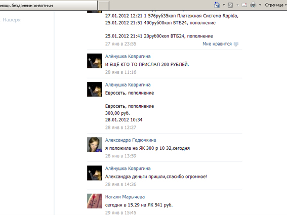 Где 949,53 -? (это только та сумма, люди которые отписалиь Вконтакте). Очень хочется видеть картину поступлений всю и почему не вся сумма переведена,( т.к. деньги на диагностику мы тратили с других животных, чеки см. выше)? Сутки она была у Вас, Алена. Вы делали на нее траты? Тогда чеки предоставьте. И зачем тогда громкая фраза от Вас о готовности лечить самой во Владимире за свои деньги? viewtopic.php?f=52&t=2671&start=60
