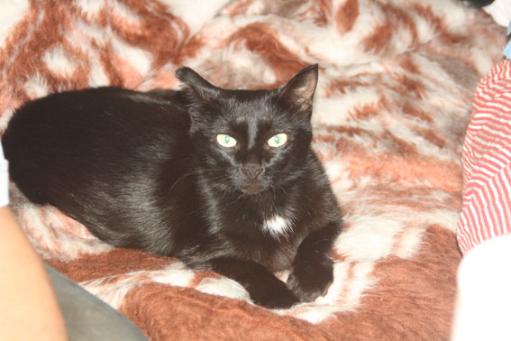 Очень ласковая. вся черная , а на грудке, на пузене и кончик хвоста белые.