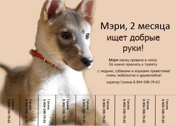 tanechka0408 писал(а):Всем привет! Хочу сообщить радостную новость: Мэри нашла наконец-то дом. Она уже очень подросла и почти не хромает. Сразу же признала нас, как хозяев (защищает). Спасибо всем тем, кто помогал ей ранее с ее проблемами. Скину фотки через месяц, посмотрите, какая она большая стала.