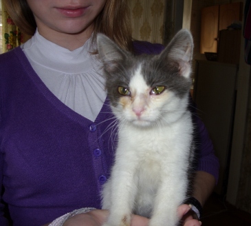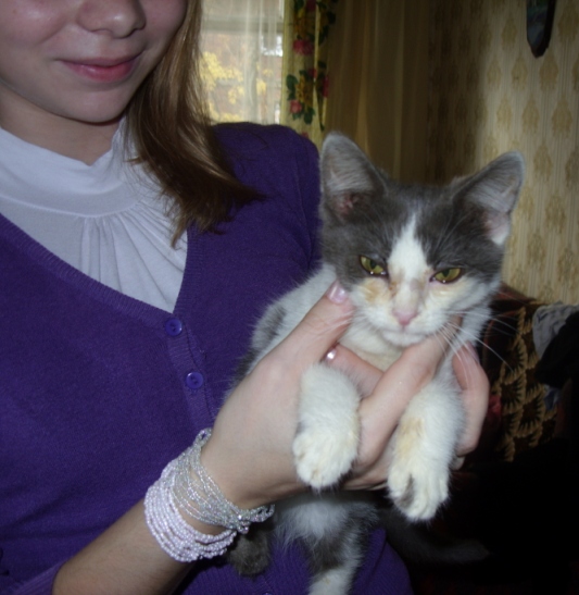 Выкладываю еще фото с того дня когда мы его только забрали.. тут более видны его проблемы с глазками.. Но Настя говорит что сейчас уже лучше. Жду вторника чтоб и на лишай проверить и всё остальное...Когда котик поправится - он будет оооочень красивый, необыкновенные янтарные глазки, серенькая мордашка...