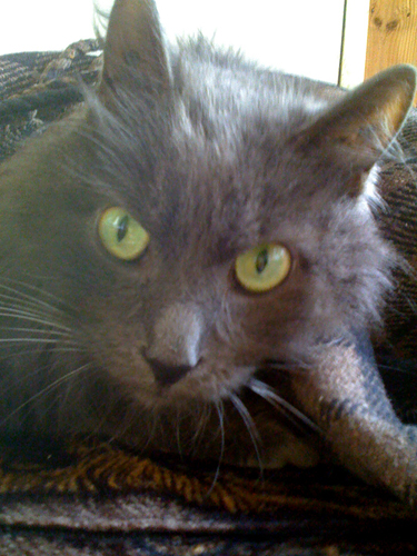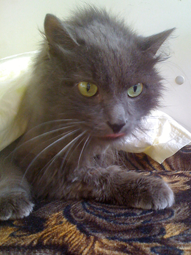 Самая животрепещущая тема на данний момент - адовые колтуны на животе и между задних лап. Они его очень сильно беспокоят. А при том, что они периодически намокают (см. выше), может возникнуть серьезное раздражение на коже, а то и воспаление. Потому вопрос: кто имеет опыт в состригании колтунов у очень пушистых кошек и сможет ненадолго приехать нам помочь?