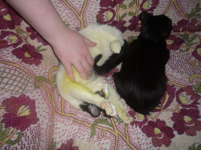 Сегодня с утра ходила с котятами в клинику, т.к. ближе всего Сириус, пошла туда ( в Артимиду далеко - полдня уйдет на поездку, а Робинзон мне не очень нравится, так что выбор у меня был не большой). Четвертый укол делать не стали, сказали что новых "пятен" нет, те что есть зарастают шерстью, но мазать сказали надо продолжать пока полностью не зарастут шерстью. После клиники я выпустила котеек на выгул, у клетки одну сторону открыла, теперь носятся по комнате. Лора уже скинула на пол цветок, который я холю и лелею уже 5 лет , все жду когда зацветет