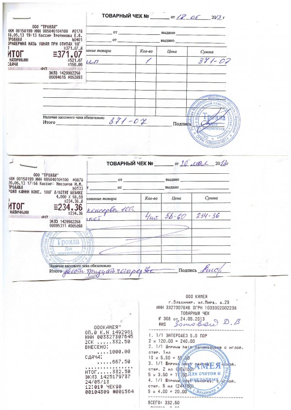 Чек за глистогонку котятам: