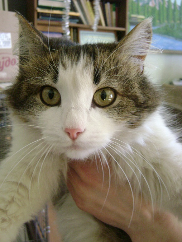 "Молодая кошечка, средней пушистости, основной цвет белый, с пятнами черного и рыжего цвета. Черненький подбородочек придает ей особый шарм. По характеру ласковая, уравновешанная,хорошо сидит на ручках, мурлыкает. Здорова, стерелизована, к лотку приучена, в еде не привередливая. В данный момент находится в приюте "Валента".